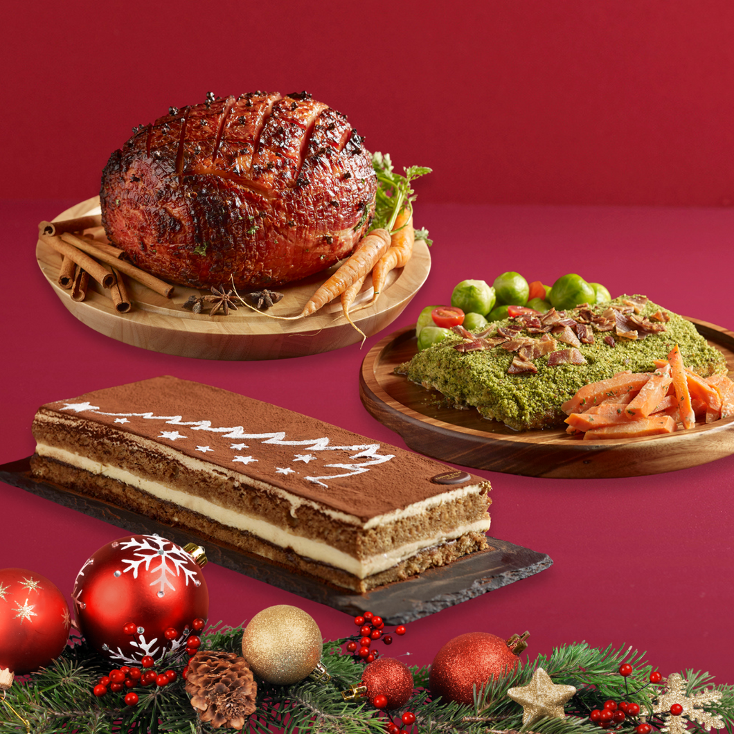 sweet, caramelised notes of our Honey-Rum Glazed Gammon Ham to the savoury decadence of Smoked Bacon & Parmesan Crusted Salmon, every bite brings comfort and cheer. End on a sweet note with your choice of Yule Log, it's the perfect Festa finale.