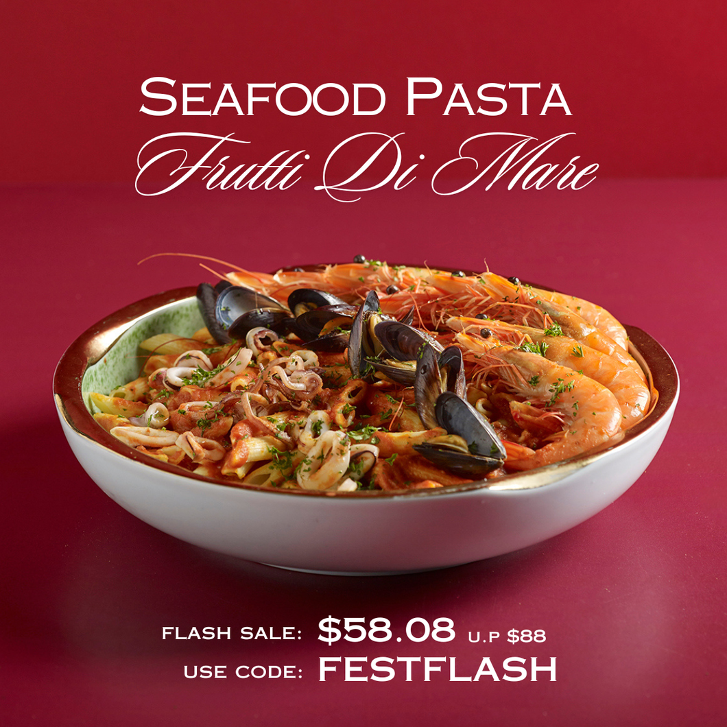 Enjoy our Frutti Di Mare, a delightful seafood medley featuring tender calamari, prawns, and black mussels. Bathed in a rich tomato sauce and garnished with fresh basil and parsley, this dish brings the taste of the ocean to your holiday table.